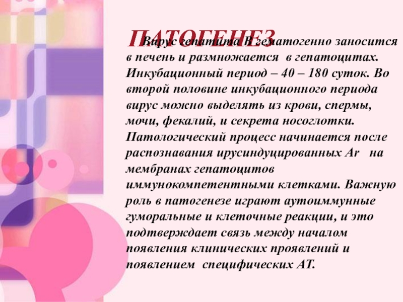 второй половине инкубационного периода вирус можно выделять из крови, спермы, мочи, фекалий, и секрета носоглотки. Патологический процесс начинается после распознавания ирусиндуцированных Ar на мембранах гепатоцитов иммунокомпетентными клетками. Важную роль в патогенезе играют аутоиммунные гуморальные и клеточные реакции, и это подтверждает связь между началом появления клинических проявлений и появлением специфических АТ.