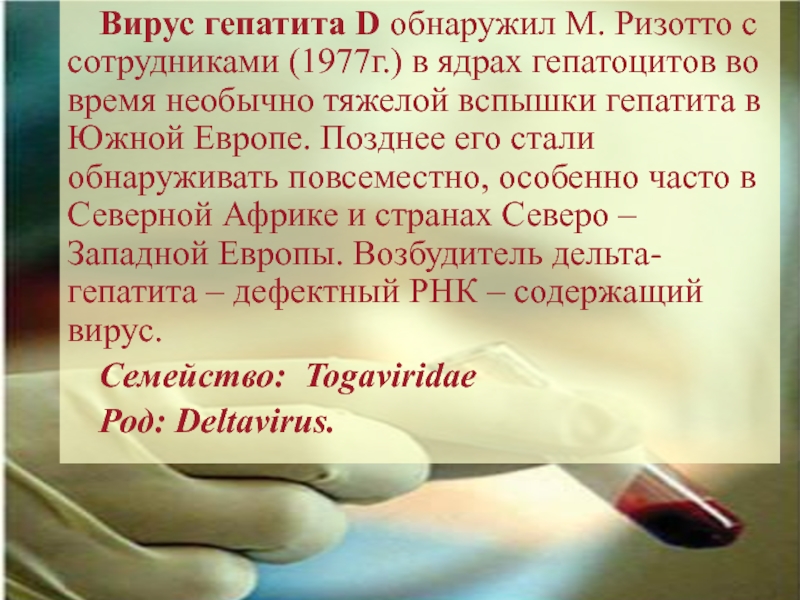 Слайд 27Вирус гепатита D обнаружил М. Ризотто с сотрудниками (1977г.) в