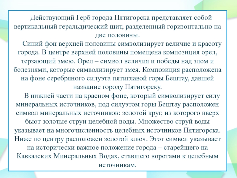 "Герб имеет форму геральдического щита. Он увенчан крепостной стеной - символом основания Пятигорска как одного из укрепленных форпостов России на Кавказе. Щит разбит на три цветных поля: одно горизонтальное, золотое и два вертикальных, красное и синее. Золотое поле - символ изобилия Кавказа и щедрости его солнца. На этом поле - силуэт горы Бештау (пять гор), от названия которой получил имя Пятигорск. Красное поле символизирует героику революционной борьбы на Пятигорье. Синее поле - символ красоты Пятигорья, опоэтизированной в литературе и живописи. На красном и синем полях - золотые ключи, источающие лечебную воду. Это - символ главного богатства Пятигорья, его животворных лечебных ресурсов. В нижней части щита - контур горы Машук - "главной кладовой" гидроминеральных сокровищ Пятигорска".