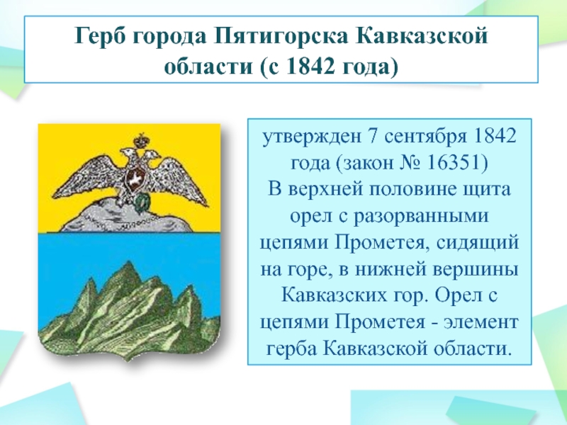 Герб города Пятигорска Кавказской области (с 1842 года)утвержден 7 сентября 1842 года (закон № 16351)  В верхней половине щита орел с разорванными цепями Прометея, сидящий на горе, в нижней вершины Кавказских
