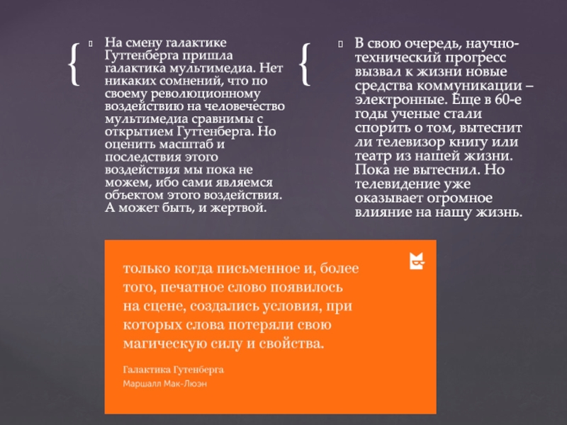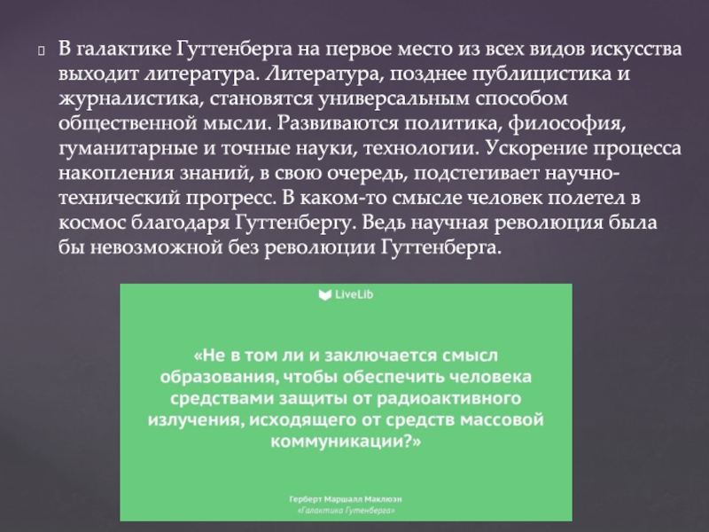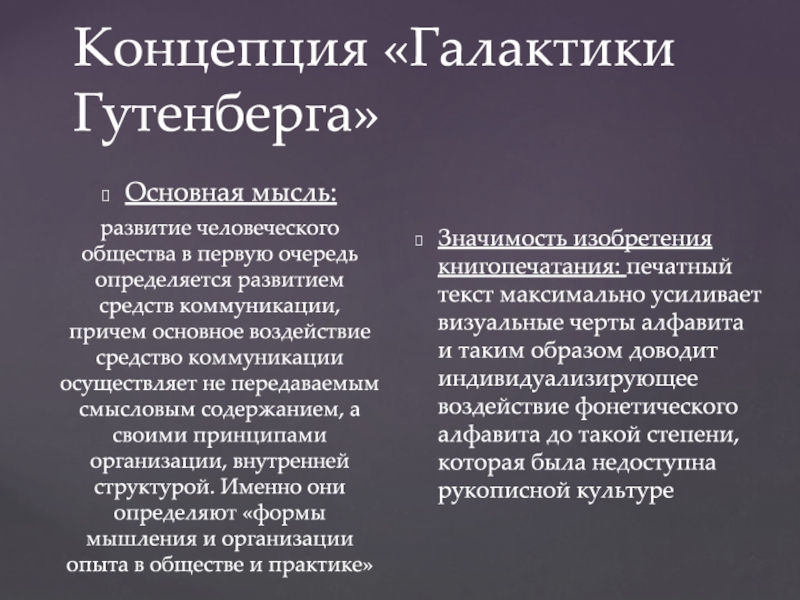 Значимость изобретения книгопечатания: печатный текст максимально усиливает визуальные черты алфавита и таким образом доводит индивидуализирующее воздействие фонетического алфавита до такой степени, которая была недоступна рукописной культуре