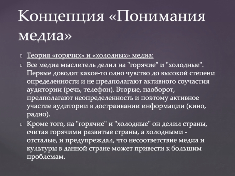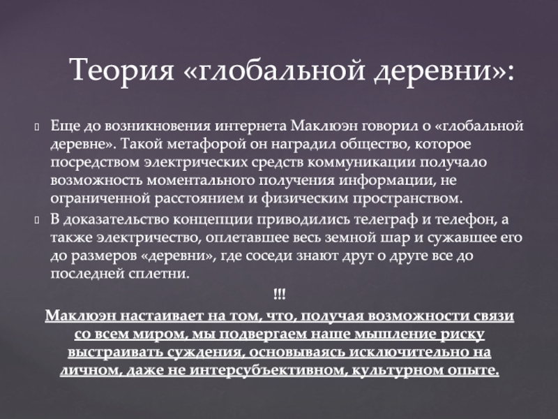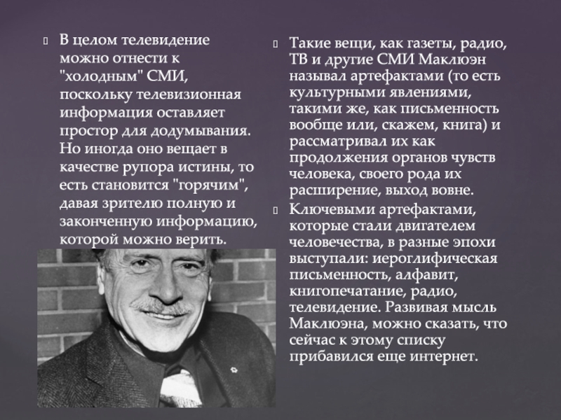 Ключевыми артефактами, которые стали двигателем человечества, в разные эпохи выступали: иероглифическая письменность, алфавит, книгопечатание, радио, телевидение. Развивая мысль Маклюэна, можно сказать, что сейчас к этому списку прибавился еще интернет.