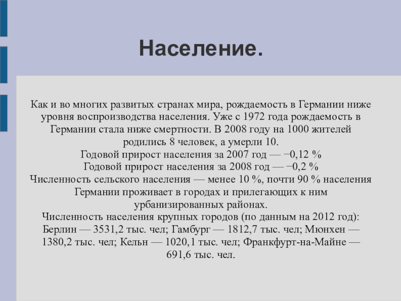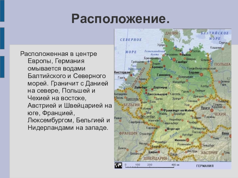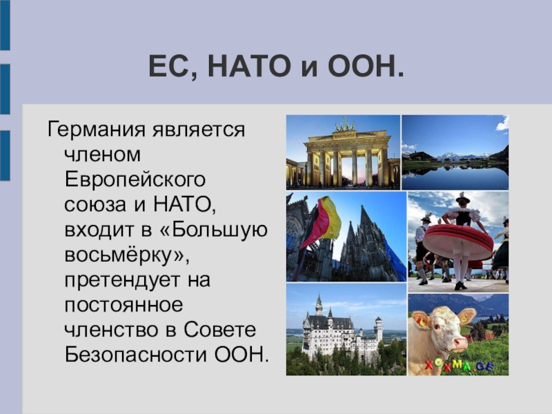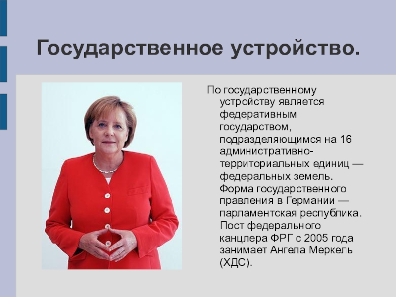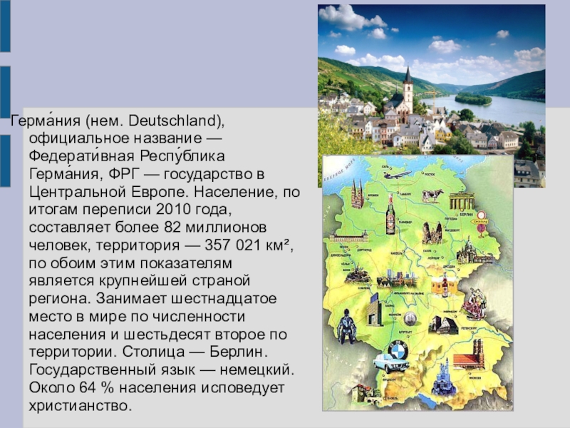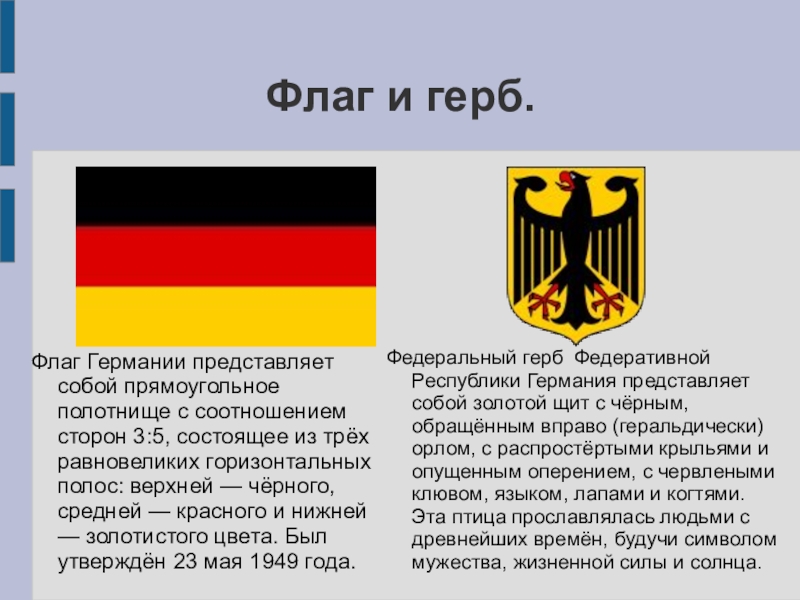 Флаг Германии представляет собой прямоугольное полотнище с соотношением сторон 3:5, состоящее из трёх равновеликих горизонтальных полос: верхней — чёрного, средней — красного и нижней — золотистого цвета. Был утверждён 23 мая 1949 года.