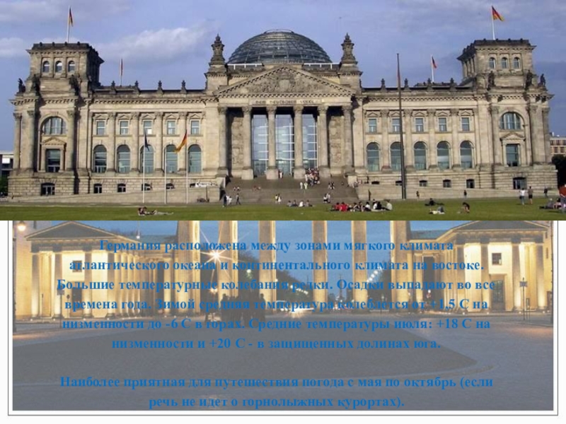 Слайд 7Германия расположена между зонами мягкого климата атлантического океана и континентального