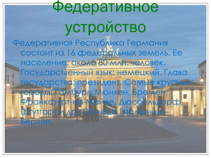 президент. Самые крупные города: Гамбург, Мюнхен, Бремен, Франкфурт-на-Майне, Дюссельдорф, Штутгарт и др. Столица Германии – Берлин.