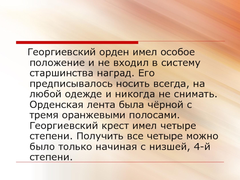 одежде и никогда не снимать. Орденская лента была чёрной с тремя оранжевыми полосами. Георгиевский крест имел четыре степени. Получить все четыре можно было только начиная с низшей, 4-й степени.