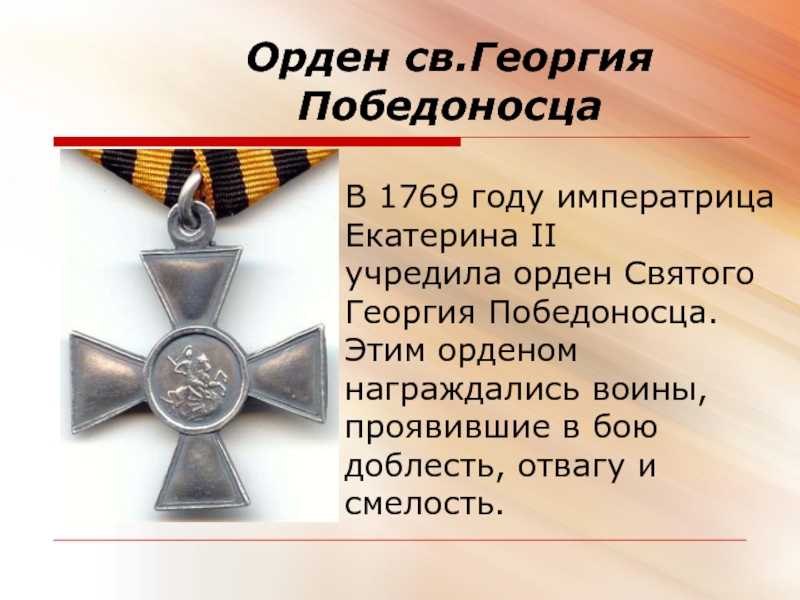 Орден св.Георгия Победоносца В 1769 году императрица Екатерина IIучредила орден Святого Георгия Победоносца.Этим орденом награждались воины, проявившие