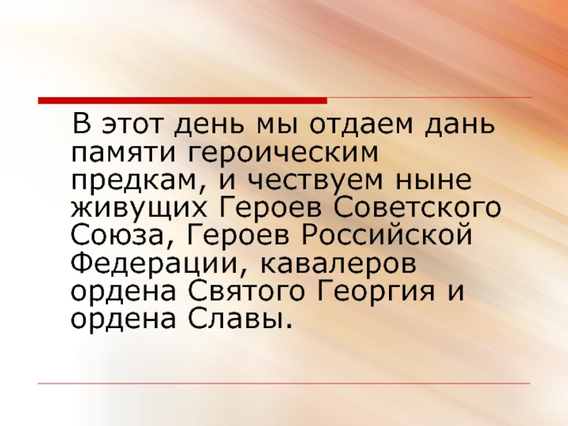 В этот день мы отдаем дань памяти героическим предкам, и чествуем ныне живущих Героев Советского Союза, Героев Российской Федерации, кавалеров ордена Святого Георгия и ордена Славы.
