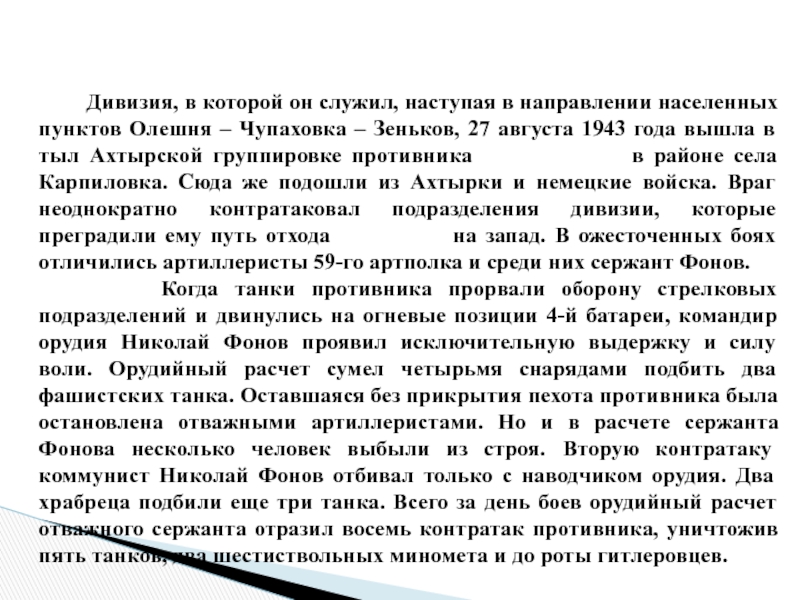 – Зеньков, 27 августа 1943 года вышла в тыл Ахтырской группировке противника в районе села Карпиловка. Сюда же подошли из Ахтырки и немецкие войска. Враг неоднократно контратаковал подразделения дивизии, которые преградили ему путь отхода на запад. В ожесточенных боях отличились артиллеристы 59-го артполка и среди них сержант Фонов.