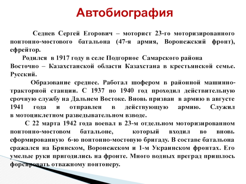 моторизированного понтонно-мостового батальона (47-я армия, Воронежский фронт), ефрейтор.