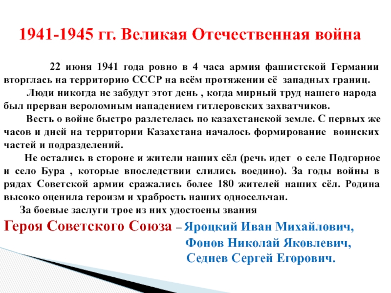 Люди никогда не забудут этот день , когда мирный труд нашего народа был прерван вероломным нападением гитлеровских захватчиков.