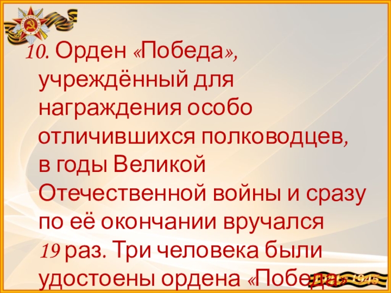 10. Орден «Победа», учреждённый для награждения особо отличившихся полководцев, в годы Великой Отечественной войны и сразу по её окончании вручался 19 раз.
