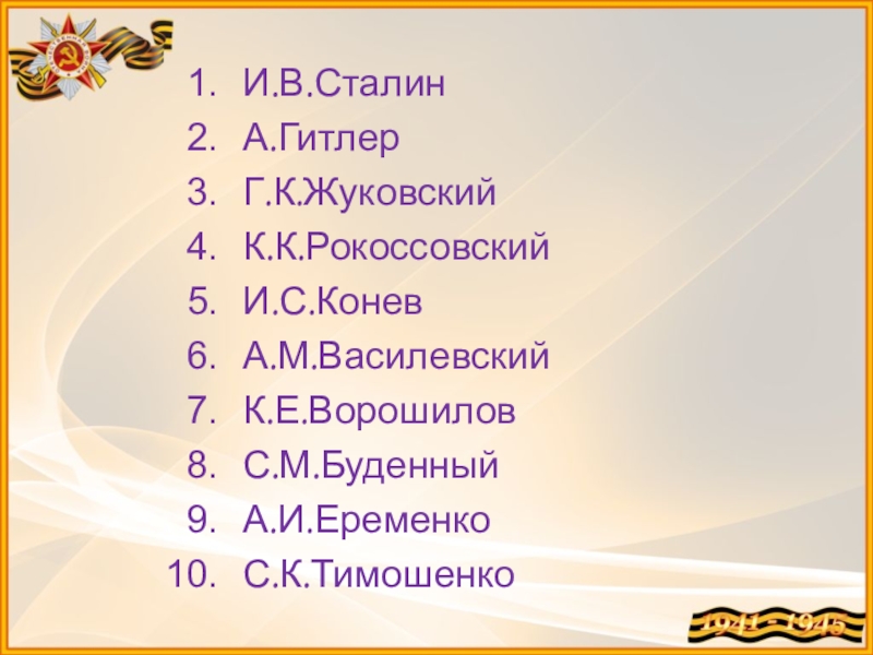 1. С.К.Тимошенко2. И.В.Сталин3. А.Гитлер4. К.Е.Ворошилов5. К.К.Рокоссовский6. Г.К.Жуков7. И.С.Конев8. А.И.Еременко9. С.М.Буденный10. А.М.Василевский