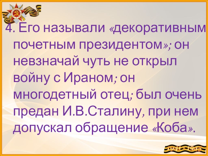 4. Его называли «декоративным почетным президентом»; он невзначай чуть не открыл войну с Ираном; он многодетный отец;