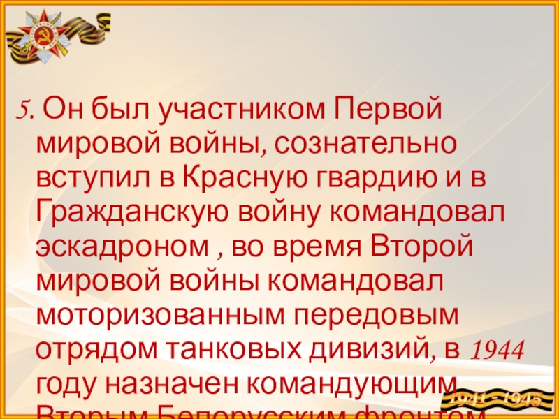 5. Он был участником Первой мировой войны, сознательно вступил в Красную гвардию и в Гражданскую войну командовал