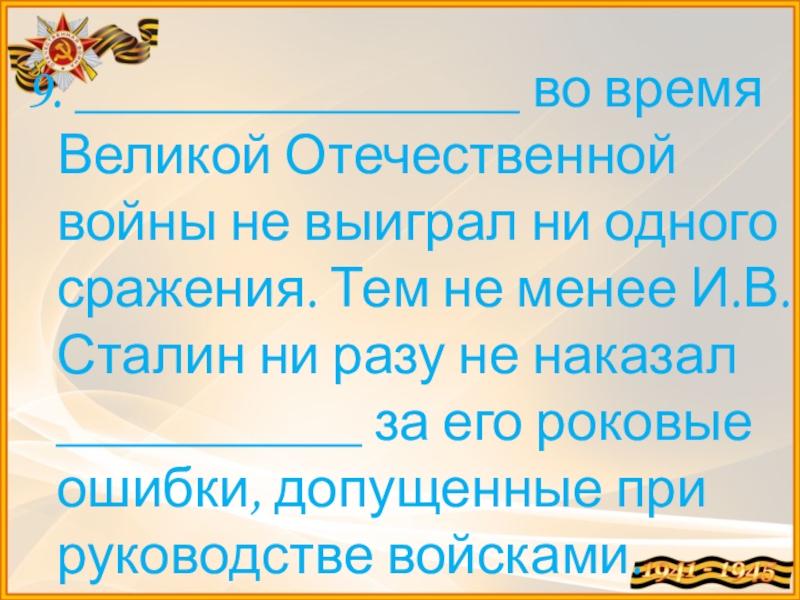 9. ________________ во время Великой Отечественной войны не выиграл ни одного сражения. Тем не менее И.В. Сталин