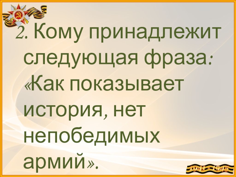 2. Кому принадлежит следующая фраза: «Как показывает история, нет непобедимых армий».