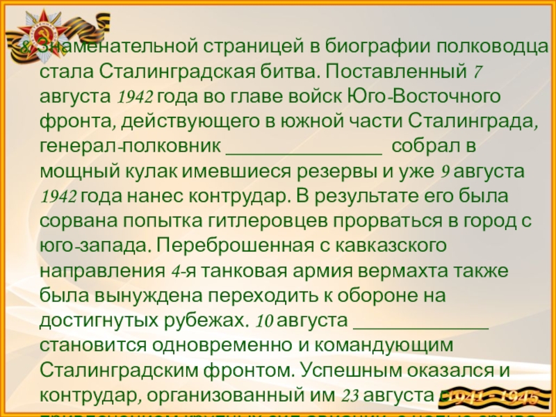 в южной части Сталинграда, генерал-полковник _______________ собрал в мощный кулак имевшиеся резервы и уже 9 августа 1942 года нанес контрудар. В результате его была сорвана попытка гитлеровцев прорваться в город с юго-запада. Переброшенная с кавказского направления 4-я танковая армия вермахта также была вынуждена переходить к обороне на достигнутых рубежах. 10 августа _____________ становится одновременно и командующим Сталинградским фронтом. Успешным оказался и контрудар, организованный им 23 августа с привлечением крупных сил авиации, с целью срыва попытки врага прорваться к Сталинграду с северо-запада.