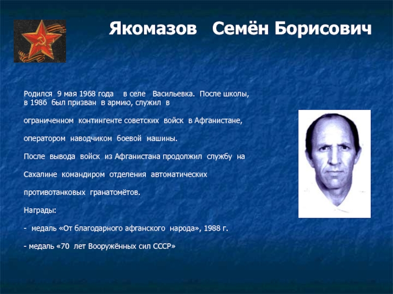 Афганистане. За выполнение интернационального долга имеет награды,