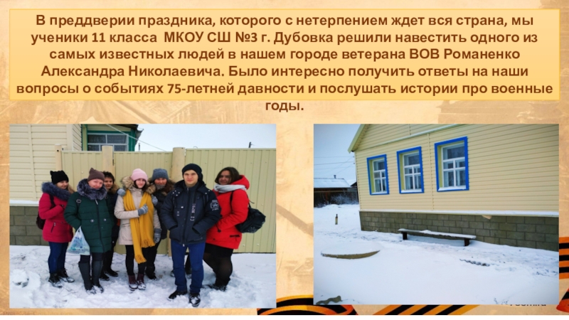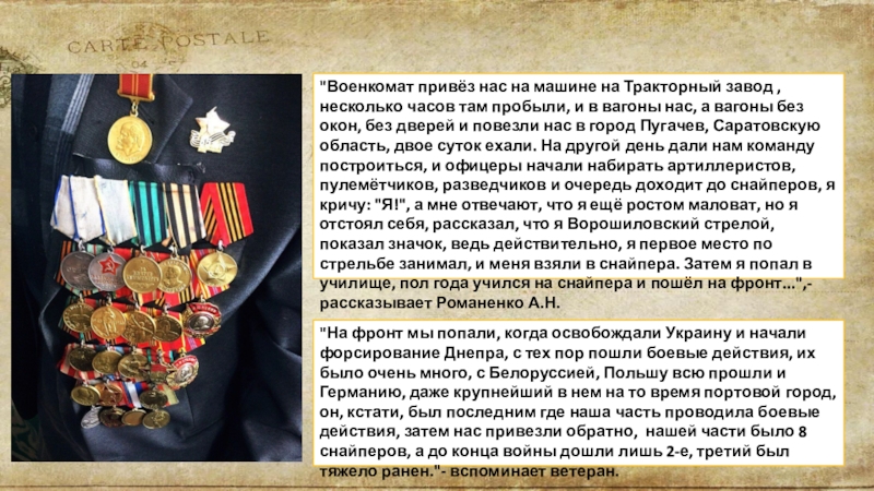 "На фронт мы попали, когда освобождали Украину и начали форсирование Днепра, с тех пор пошли боевые действия, их было очень много, с Белоруссией, Польшу всю прошли и Германию, даже крупнейший в нем на то время портовой город, он, кстати, был последним где наша часть проводила боевые действия, затем нас привезли обратно, нашей части было 8 снайперов, а до конца войны дошли лишь 2-е, третий был тяжело ранен."- вспоминает ветеран.