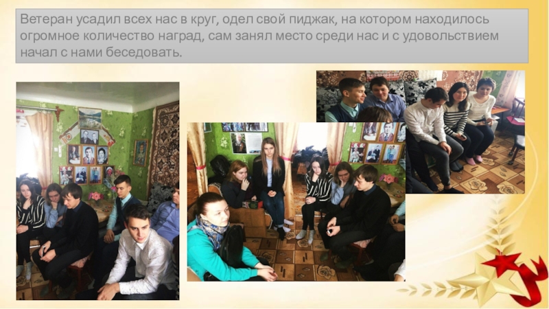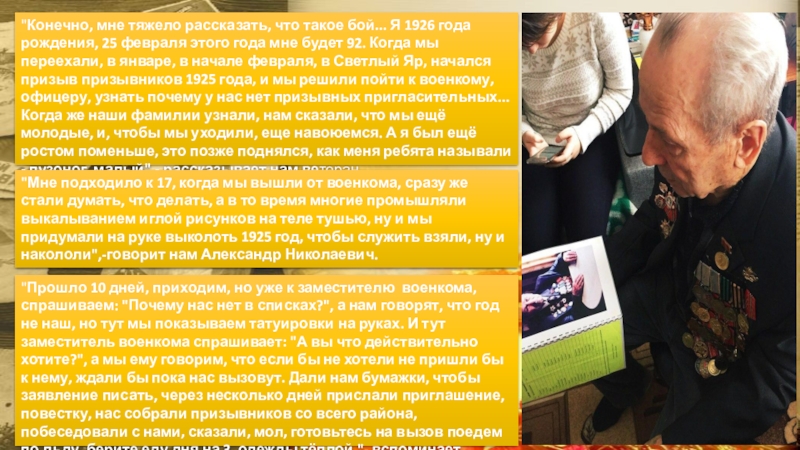 "Прошло 10 дней, приходим, но уже к заместителю военкома, спрашиваем: "Почему нас нет в списках?", а нам говорят, что год не наш, но тут мы показываем татуировки на руках. И тут заместитель военкома спрашивает: "А вы что действительно хотите?", а мы ему говорим, что если бы не хотели не пришли бы к нему, ждали бы пока нас вызовут. Дали нам бумажки, чтобы заявление писать, через несколько дней прислали приглашение, повестку, нас собрали призывников со всего района, побеседовали с нами, сказали, мол, готовьтесь на вызов поедем по льду, берите еду дня на 3, одежды тёплой."- вспоминает ветеран.