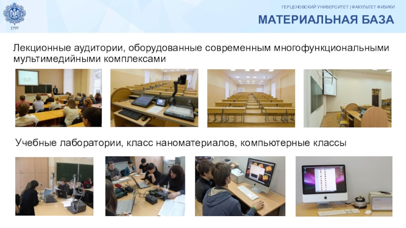 Аудитории оснащены оборудованием для проведения демонстрационного эксперимента, а также многофункциональными мультимедийными комплексами.