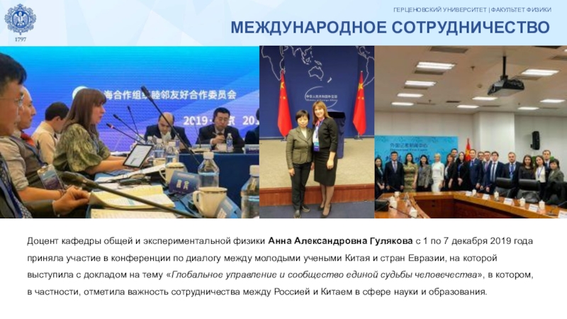 конференции по диалогу между молодыми учеными Китая и стран Евразии, на которой выступила с докладом на тему «Глобальное управление и сообщество единой судьбы человечества», в котором, в частности, отметила важность сотрудничества между Россией и Китаем в сфере науки и образования.