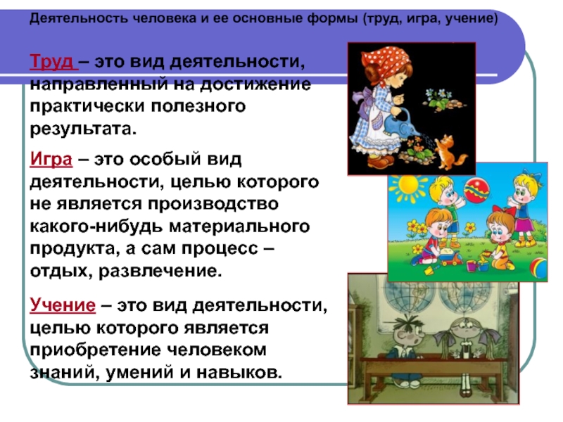 Слайд 32Деятельность человека и ее основные формы (труд, игра, учение)