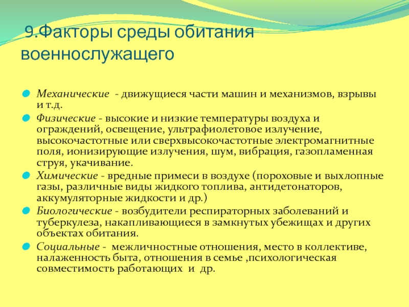 Слайд 9 9.Факторы среды обитания военнослужащего