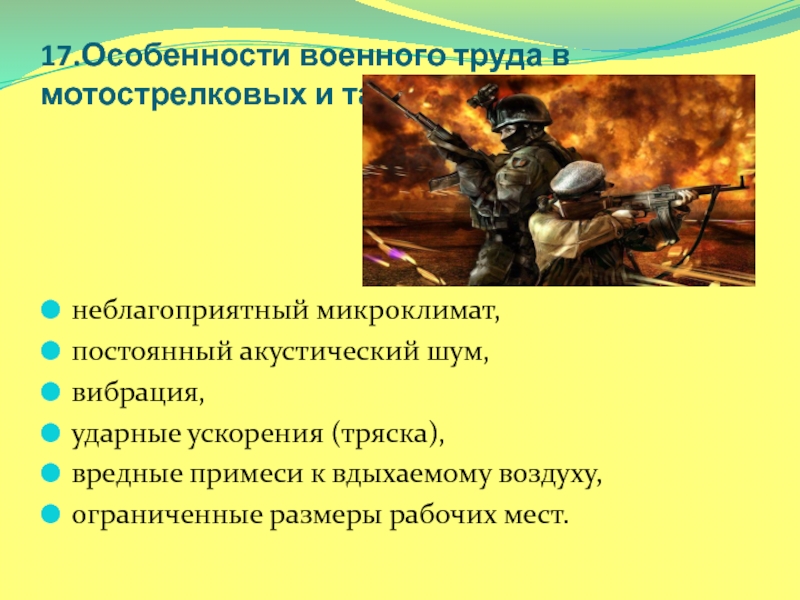 Слайд 1717.Особенности военного труда в мотострелковых и танковых войсках