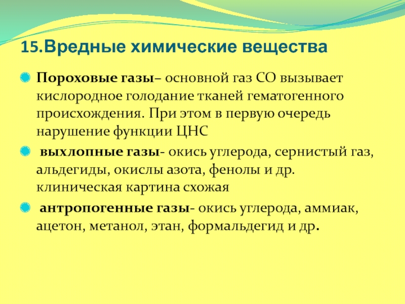 Химические - вредные примеси в воздухе (пороховые и выхлопные газы, различные виды жидкого топлива, антидетонаторов, аккумуляторные жидкости и др.)