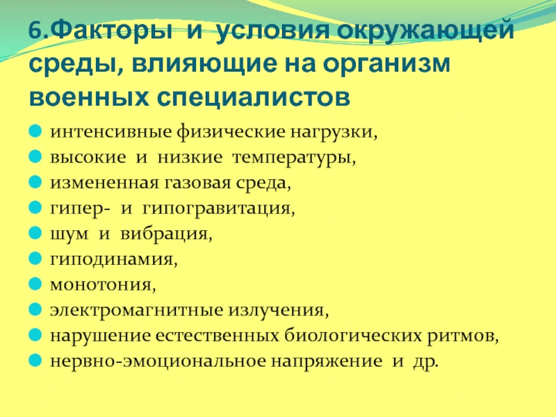 Слайд 66.Факторы и условия окружающей среды, влияющие на организм военных специалистов