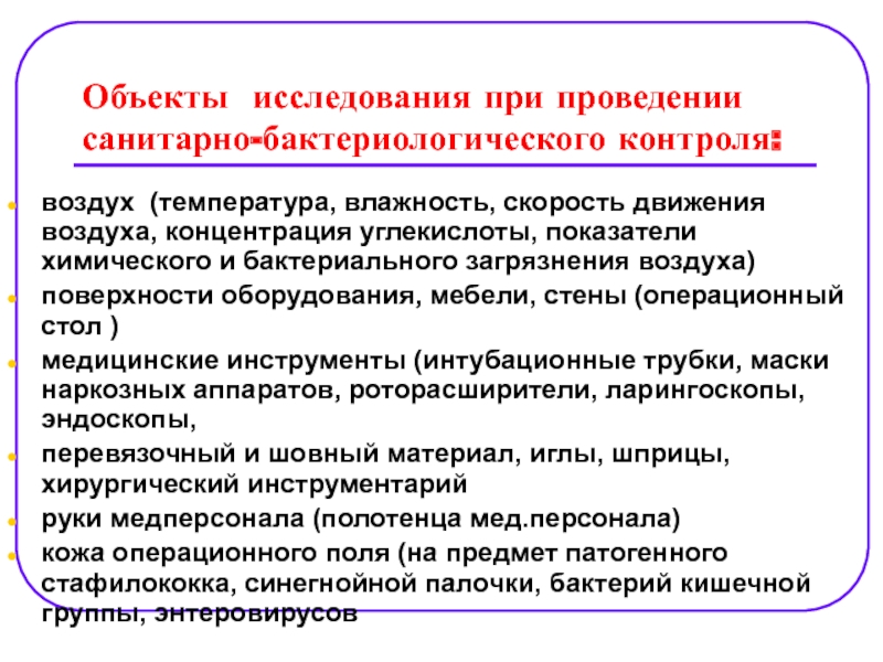 Объекты исследования при проведении санитарно-бактериологического контроля: