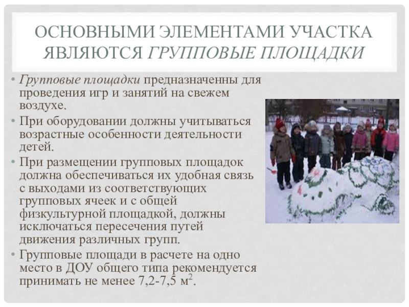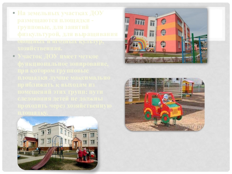 Слайд 7На земельных участках ДОУ размещаются площадки - групповые, для занятий