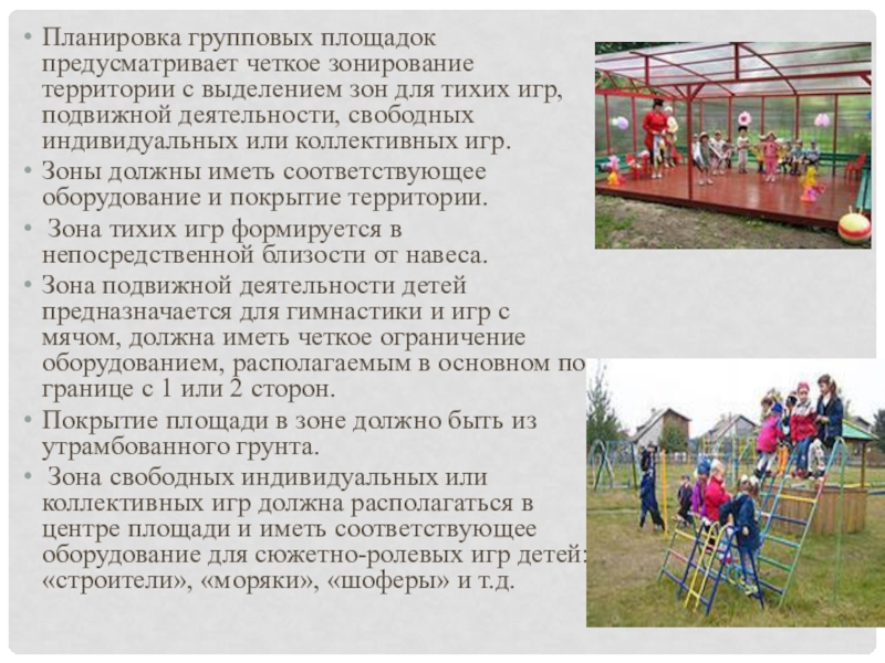 Слайд 10Планировка групповых площадок предусматривает четкое зонирование территории с выделением зон