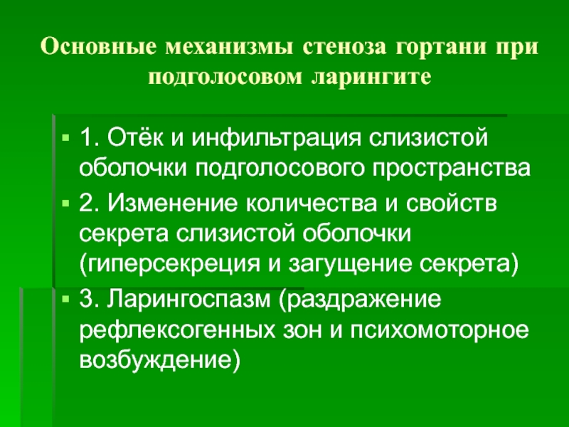 Основные механизмы стеноза гортани при подголосовом ларингите1. Отёк и инфильтрация слизистой оболочки подголосового пространства2. Изменение количества и