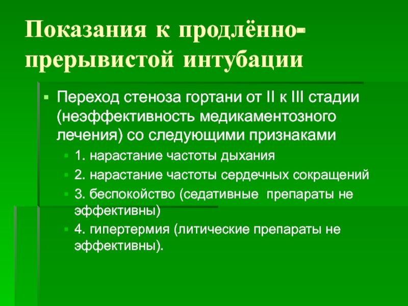Показания к продлённо-прерывистой интубацииПереход стеноза гортани от II к III стадии (неэффективность медикаментозного лечения) со следующими признаками1.