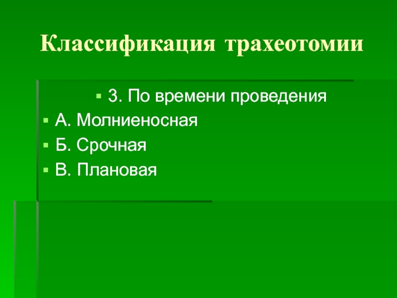 Классификация трахеотомии3. По времени проведенияА. МолниеноснаяБ. СрочнаяВ. Плановая