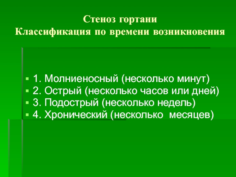 Стеноз гортани Классификация по времени возникновения1. Молниеносный (несколько минут)2. Острый (несколько часов или дней)3. Подострый (несколько недель)4.