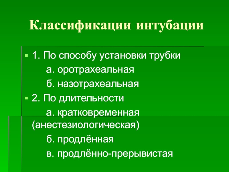 Классификации интубации1. По способу установки трубки 		а. оротрахеальная		б. назотрахеальная2. По длительности		а. кратковременная (анестезиологическая)		б. продлённая		в. продлённо-прерывистая