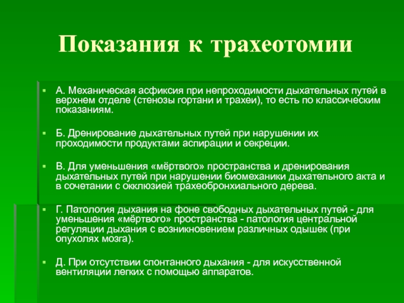 Показания к трахеотомииА. Механическая асфиксия при непроходимости дыхательных путей в верхнем отделе (стенозы гортани и трахеи), то