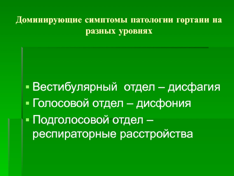 Доминирующие симптомы патологии гортани на разных уровняхВестибулярный отдел – дисфагияГолосовой отдел – дисфонияПодголосовой отдел – респираторные расстройства