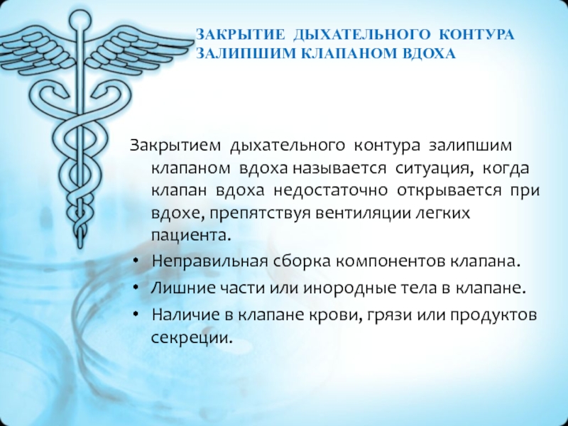 Слайд 19ЗАКРЫТИЕ ДЫХАТЕЛЬНОГО КОНТУРА ЗАЛИПШИМ КЛАПАНОМ ВДОХА