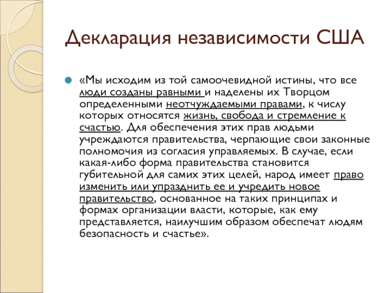 к числу которых относятся жизнь, свобода и стремление к счастью. Для обеспечения этих прав людьми учреждаются правительства, черпающие свои законные полномочия из согласия управляемых. В случае, если какая-либо форма правительства становится губительной для самих этих целей, народ имеет право изменить или упразднить ее и учредить новое правительство, основанное на таких принципах и формах организации власти, которые, как ему представляется, наилучшим образом обеспечат людям безопасность и счастье».