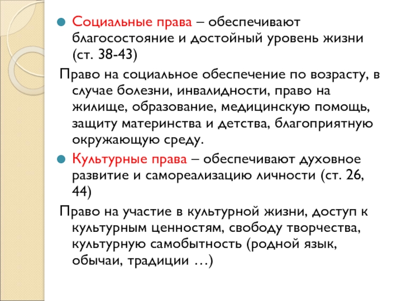 Слайд 12Социальные права – обеспечивают благосостояние и достойный уровень жизни (ст.