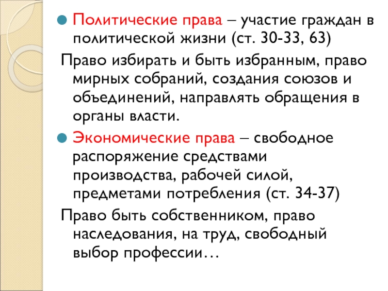Экономические права – свободное распоряжение средствами производства, рабочей силой, предметами потребления (ст. 34-37)