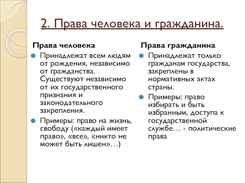 Примеры: право избирать и быть избранным, доступа к государственной службе… - политические права