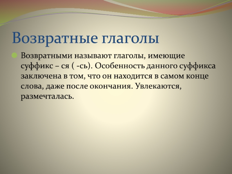 Возвратными называют глаголы, имеющие суффикс – ся ( -сь).