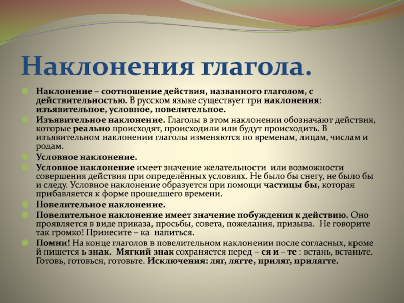 Наклонение – соотношение действия, названного глаголом, с действительностью. В