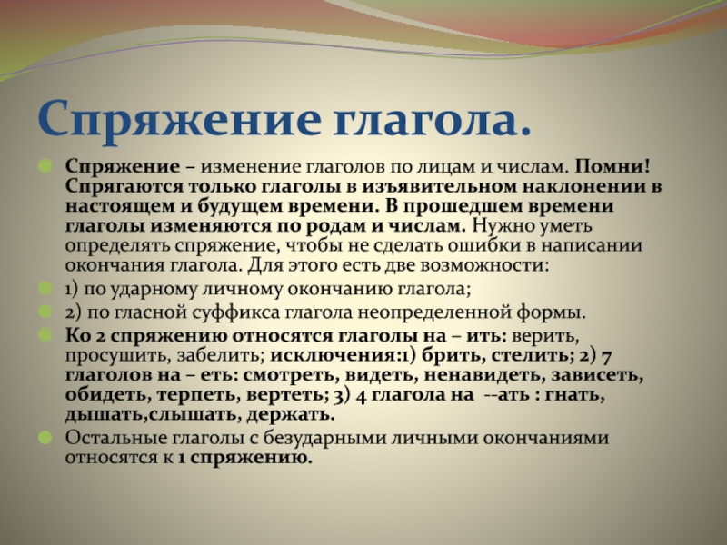 Ко 2 спряжению относятся глаголы на – ить: верить, просушить, забелить; исключения:1) брить, стелить; 2) 7 глаголов на – еть: смотреть, видеть, ненавидеть, зависеть, обидеть, терпеть, вертеть; 3) 4 глагола на --ать : гнать, дышать,слышать, держать.